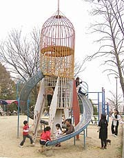 公園で、たくさんの子供たちが遊んでいたのが、ロケットの形のすべり台。